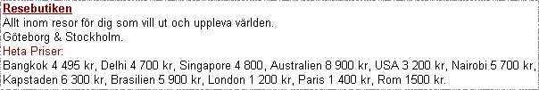 - En sida med prisjämförelser på flygbiljetter till olika destinationer (vill ni vara med här och presentera era bästa priser för olika destinationer, hör av er så kan vi diskutera pris för detta).