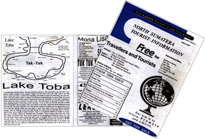 På turistorterna i Norra Sumatra, distribueras en gratis liten månadstidning med information för dig som besöker denna region. Där finns restips och fakta om olika resmål. Priser på vad transporter kostar, insändare och tips från andra läsare.