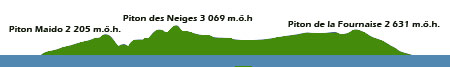 Sammanlagt har Reunion 210 kilometer kustlinje, varav 35 kilometer strand och ett inland med vulkaner (högst är Piton des Neiges med 3 069 meter).