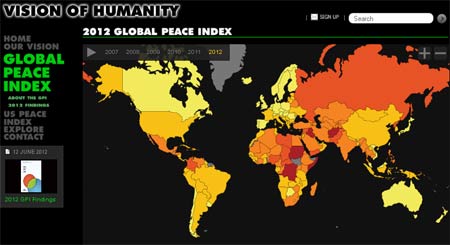 På följande sida finns en interaktiv världskarta där du dels ser hur fredliga olika delar av världen är via färgkoder. Ljusgult betyder mycket fredligt och mörkt rött betyder att det inte är fredligt. Du kan även föra muspekaren över karta och se hur länderna är rankade: