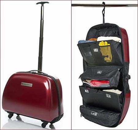 En variant på en portabel klädhylla, är Move från tillverkaren Max Mirani. Det är en kombination av kabinväska på fyra hjul med teleskophandtag, som på plats på hotellrummet går att vika ut och hänga upp i garderoben (så att du inte behöver packa upp kläderna ur väskan när du är framme). Storleken på Move är cirka 55 x 35 x 25 cm: